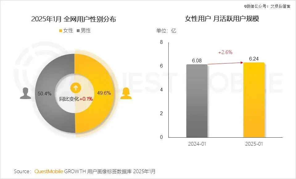 QuestMobile数据显示,全网女性用户规模已达6.24亿,并在线上高消费能力凸显,在视频、生活等领域规模增长显著。女性用户占据全网近50%份额,2025年1月全网女性活跃用户规模同比增长2.6%,已达6.24亿。