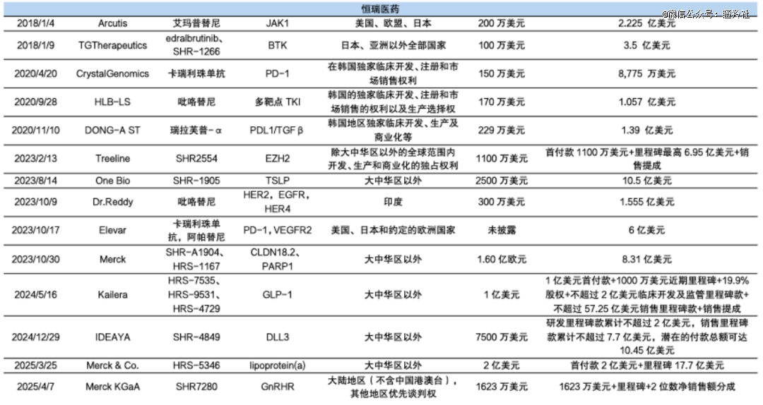 目前来看,不管是pharma还是biotech阵营,均有形成丰厚业绩蓄水池的选手。例如,恒瑞医药近三年完成近10笔合作,至今累计交易近15笔,金额约140亿美元。其中部分管线可能会有“意外”,但也必然会有部分企业触发里程碑付款,为其带来增量。