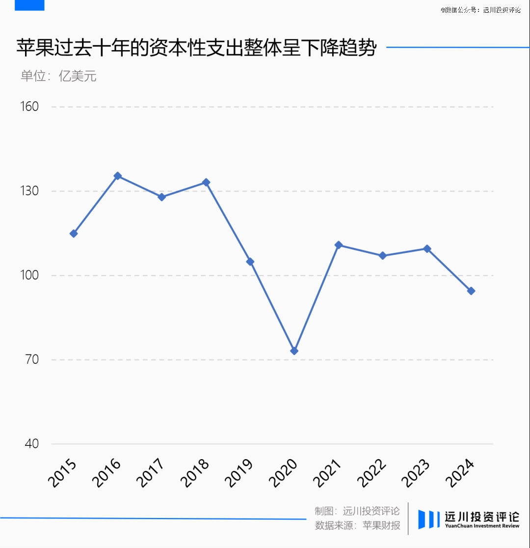但相较于同行间动辄近乎千亿的AI资本开支,苹果却显得十分保守。数据显示,2024财年苹果的资本性支出为94.47亿美元,相较于10年前不增反降。