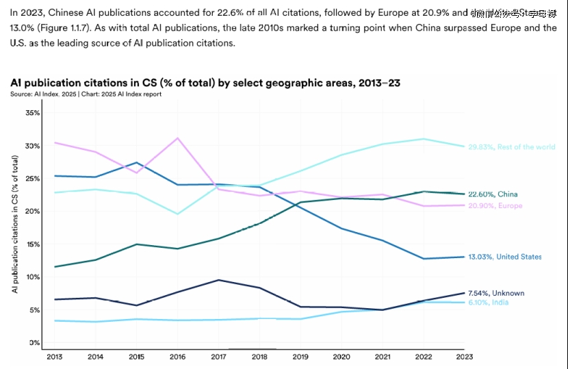 而且在世界范围内,华人是参与和推动AI研究的最主要的力量。根据斯坦福大学发表的AI行业研究报告,华人参与的AI论文被引用数量从2021年超过欧洲之后,就一直处于世界*。而印度裔科学家的影响力只有华人的四分之一左右。