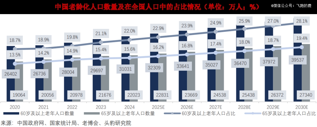 国家统计局数据,2023 年,中国 60 岁及以上人口占 21.1%,65 岁及以上占 15.4% 。2024 年,60 岁及以上老年人口 3.1 亿,占 22%;65 岁及以上 2.2 亿,占 15.6% 。依联合国标准,中国已全面进入中度老龄化社会。