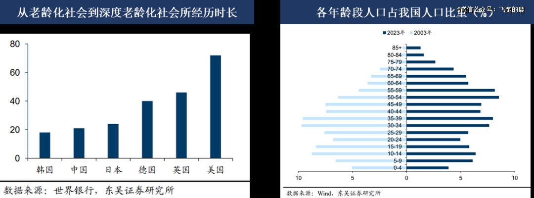 横向对比下各国老龄化情况。联合国标准说,一个国家 65 岁以上人口占比达 7%,就迈入老龄化社会;占比到 14%,就是深度老龄化社会了。主要经济体里,像我国、韩国、日本这些亚洲国家,从进入老龄化到深度老龄化,花的时间较短;英国、美国、德国等欧美发达经济体,经历的时间就比较长。