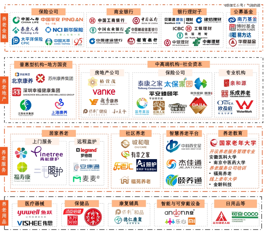 近几年,在政策一路 “绿灯” 支持鼓励下,养老产业越来越壮大。其中金融、地产、服务、用品这四大板块,已经成长出不少有代表性的企业。这些企业涉及 12 个养老产业大类,从老年人的养老资金保障,到消费需求满足,再到各类服务提供,都能给予全面支持。