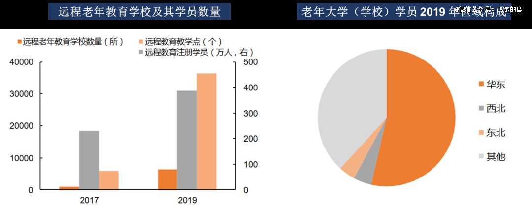 3、网络数字化教育成老年教育重要形式。据不完全统计,2019 年末远程老年教育学校 6345 所、教学点 3.6 万余个,约为 2017 年 6 倍;注册学员 387.4 万,较 2017 年增 68.9%,面授与网络学员数比约 7:4 。