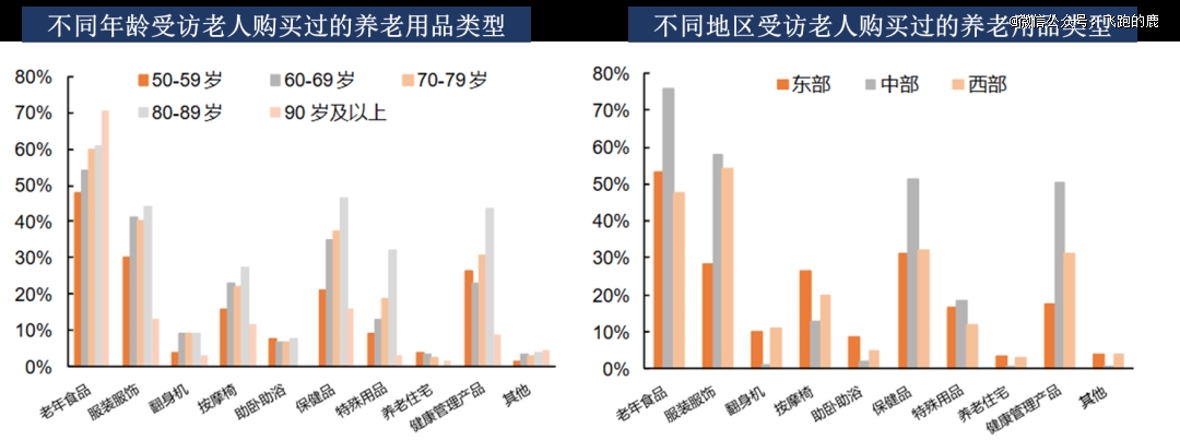 不同年龄购买养老用品差异大。50 - 89 岁人群随年龄增长,对部分用品购买率上升;90 岁以上老人*老年食品,其他用品购买率大降。中部地区老人购买老年食品比例最高,对多种用品偏好度高,更青睐老年食品。