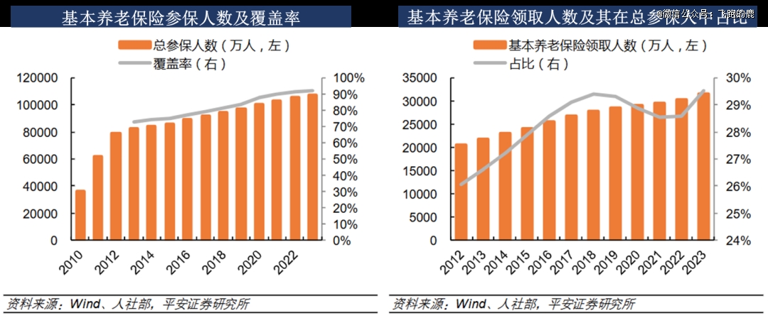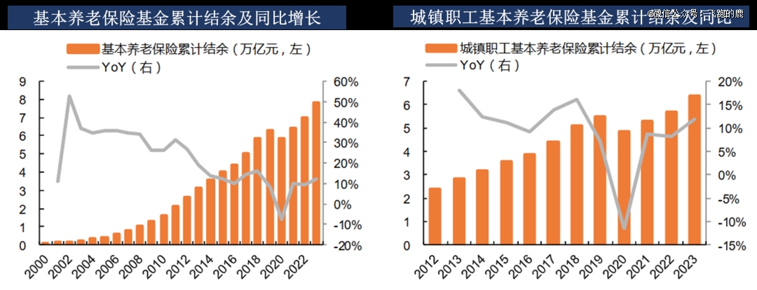 据 2023 年人社统计公报,2023 年末参保 10.66 亿人,覆盖率 91.8% ,城镇职工 5.21 亿、城乡居民 5.45 亿,领取人数 3.15 亿,占比 29.5% ;基金累计结余 7.82 万亿(同比 + 11.91%),城镇职工基金结余 6.36 万亿(同比 + 11.86%)。因覆盖率升与企业职工缴费比例下调,近年基金累计结余增速放缓。
