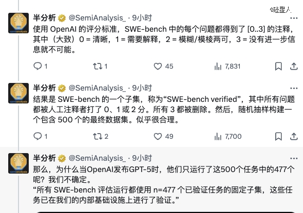 此外,更吊诡的是,SWE‑Bench Verified是OpenAI推出来的一个“精炼版”。因为原本的 SWE‑Bench有2294个软件工程问题,OpenAI觉得这些题目中有些太难、太不稳定,无法公平评估模型的编程能力,于是OpenAI自己选了500道题,让评测更靠谱 。结果更离谱的是这个“自己选的子集”,又被砍掉一部分,剩下477道题跑评测。