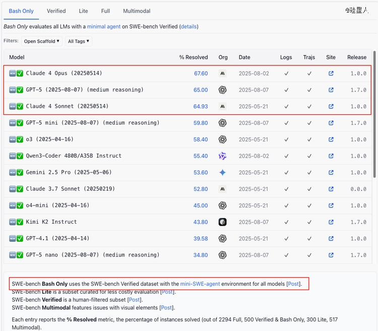 至于OpenAI为什么要删除23道测试题而不是用完整版,答案也许就在下面的排名中。在SWE‑Bench Verified完整版,也就是500道题目的基准下,GPT5并没有超越claude 4 Opus。