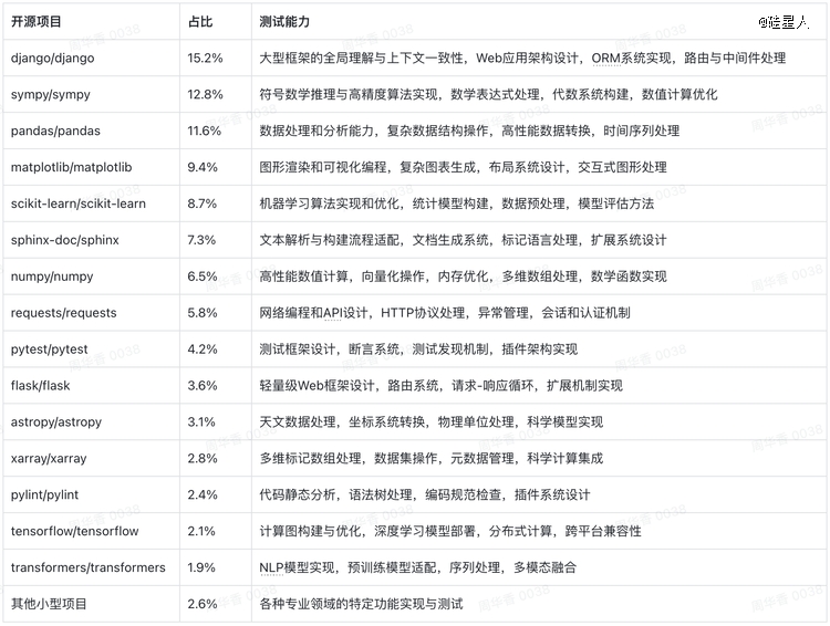 每个项目会测试大模型各个方面的代码能力。比如django/django:作为占比最高的项目,主要测试开发者对大型Web框架的理解能力,特别是在数据库查询优化、URL路由、中间件处理等方面。pandas/pandas:数据分析领域的代表,测试对数据结构和数据处理算法的掌握程度,特别是在处理大规模数据和复杂数据转换方面。