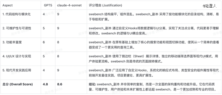为了更客观,我们还引入Gemini 2.5 Pro对两个项目进行评分。结果显示claude-4-sonnet生成的项目在几乎所有关键维度上都优于GPT5。前者以模块化架构为核心,将组件按功能分区,并通过自定义Hooks实现数据与视图的分离,可维护性和可读性更佳;后者则采用扁平化组件结构,数据逻辑与UI高度耦合,更像一个原型验证型应用。