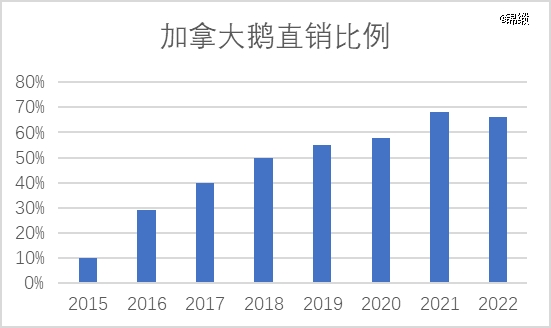 虽然改革卓有成效,但公司门店的直营化率只有40%,作为对比,Moncler直营比例80%,加拿大鹅在品牌扩大影响力的2015-2021年,也将直营化率从不到10%快速提升到接近70%。