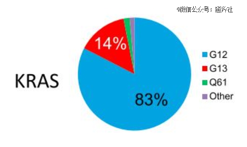 KRAS最常见的突变位点是G12(占到所有突变位点的83%),主要突变类型有G12D(33%)、G12V(23%)、G12C(11%)和G13D(12%)。