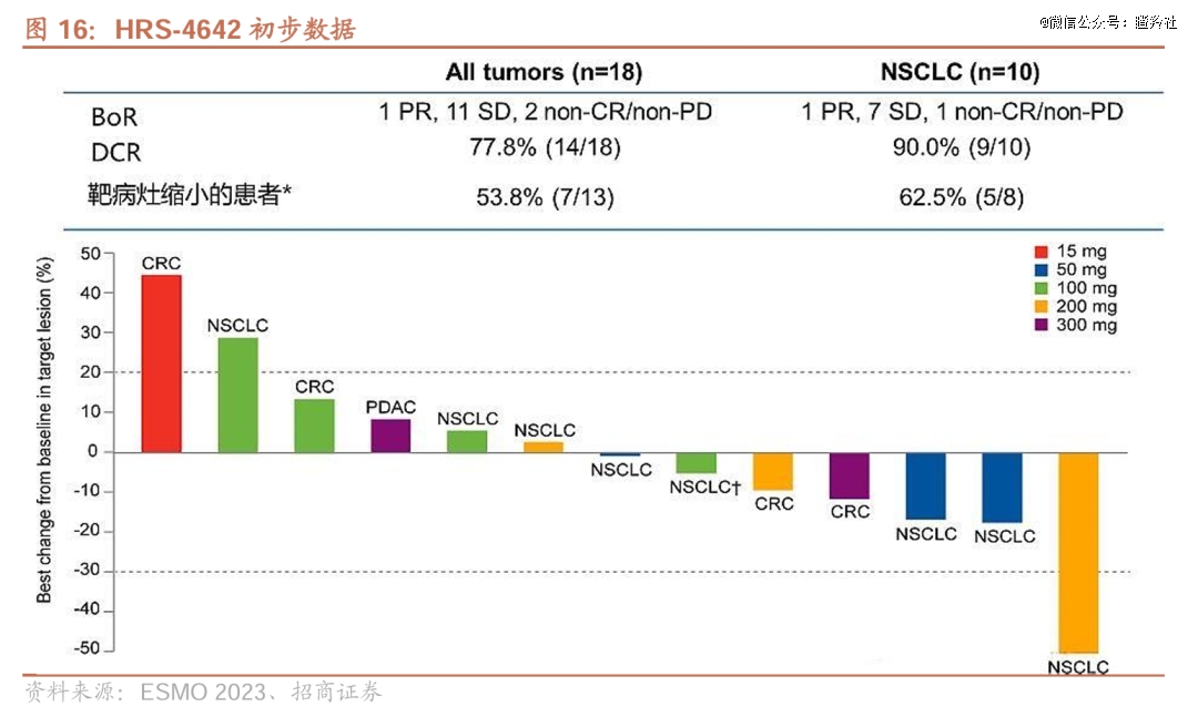 恒瑞医药早在2023 ESMO药公布HRS-4642的初步数据,研究共纳入18例患者(包括10例肺腺癌患者、5例结直肠癌等,中位治疗线数为3,Q2W),18例患者共有11例患者(61.1%)病情稳定,6例(33.3%)靶病灶缩小。