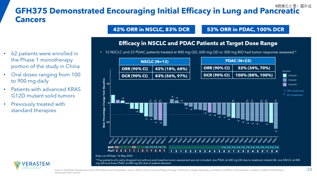 2025 ASCO大会公布的GFH375/VS-7375最新研究数据显示(经治晚期KRAS G12D突变实体瘤患者,75%的患者入组时已经接受过二线及以上治疗):在23名可评估的胰腺导管腺癌(PDAC)患者中,ORR达到了52%,DCR更是高达100%,这意味着所有接受治疗的胰腺癌患者的病情都得到了控制或改善。而在12名可评估的非小细胞肺癌患者中,ORR为42%,DCR为83%。(以上两个队列患者接受400mgQD、600mgQD或300mgBID治疗)