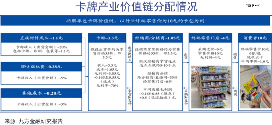 卡牌是少有的价值链主要分配在终端环节的产业。从价值链拆解来看,卡牌产业零售端约占到整个产业链价值量的40%,发行运营商占到30%,经销商占10%,而IP版权费用和材料这两种“硬成本”,加起来仅占20%左右。