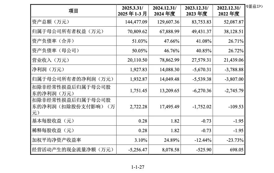 2022-2024年及今年第 一季度(下称:报告期),联讯仪器的营业收入分别约2.14亿、2.76亿、7.89亿、2.01亿元;综合毛利率分别为43.61%、60.50%、63.63%、65.33%;净利润分别约-3788.88万、-5670.31万、1.41亿、1927.83万元,归母净利润分别约-3807.00 万、-5539.38万、1.40亿、1932.87万元。
