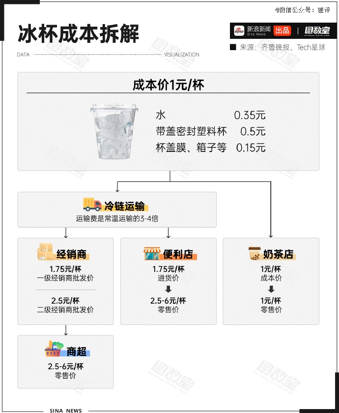 齐鲁晚报也拆解过,一个冰杯总成本为 1 元,其中水 0.35元,带盖密封塑料杯 0.5 元,其他 0.15 元,算上冷链运输等环节,到了一级经销商/便利店环节,批发价已经到了 1.75/杯,往下成本只会更贵。