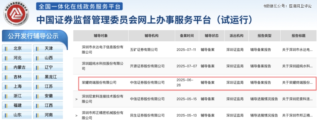根据证监会官网的内容,今年下半年荣耀终端股份有限公司(荣耀)已在深圳证监局进行上市辅导备案,中信证券担任辅导机构。