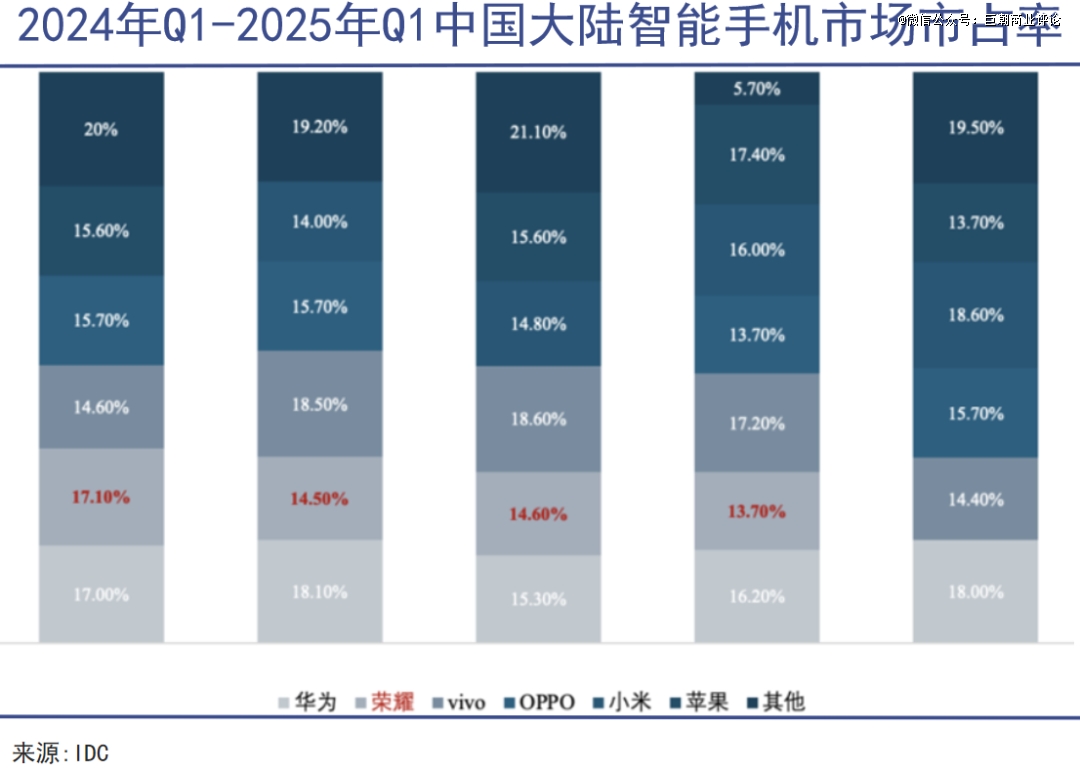 华为消费者业务全面复苏。据IDC数据,华为手机市场份额从2023年第四季度的13.7%攀升至去年四季度的16.2%,而同期荣耀则从16.8%萎缩至13.7%。到今年一季度,荣耀进一步跌出了前五名的序列。