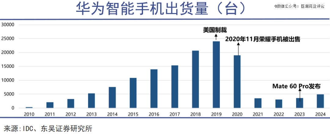 2020年,华为遭受美国多轮制裁,直接封死了华为从第三国购买带有美国技术产品的渠道,尤其是无法获得台积电代工,强行阻断了华为5G芯片的研发进程。受此影响,当年华为手机的出货量遭遇断崖式下跌,从2019年巅 峰期的2.4亿部骤降至2022年的不到3000万部。