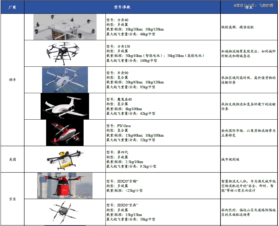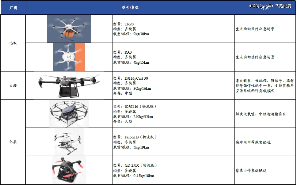 大型无人机研发主要由传统无人机企业负责,大多采用固定翼架构,像壹通无人机、白鲸航线、航天时代飞鹏、天域航通、四川腾盾等企业都在做。不过目前多数这类机型还处在适航审定阶段。而在末端或短途支线物流中,多旋翼或复合翼机型是主力军。