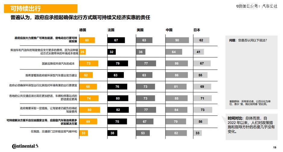 即便是与新能源汽车接受度最高的中国相比,欧盟对内燃机的禁售政策都稍显激进。《2024未来出行趋势调研报告》显示,在可持续出行方面,中国消费者的认可度达90%,而德国、法国等欧盟用户对政府必须大力推广可持续出行的认可度只有六成。