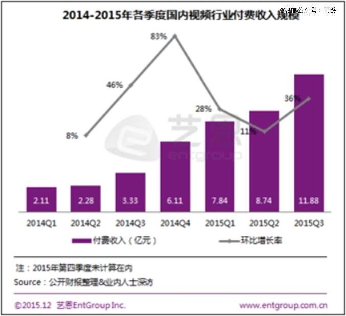 2014-2015年各季度国内视频行业付费收入规模(图源:艺恩)