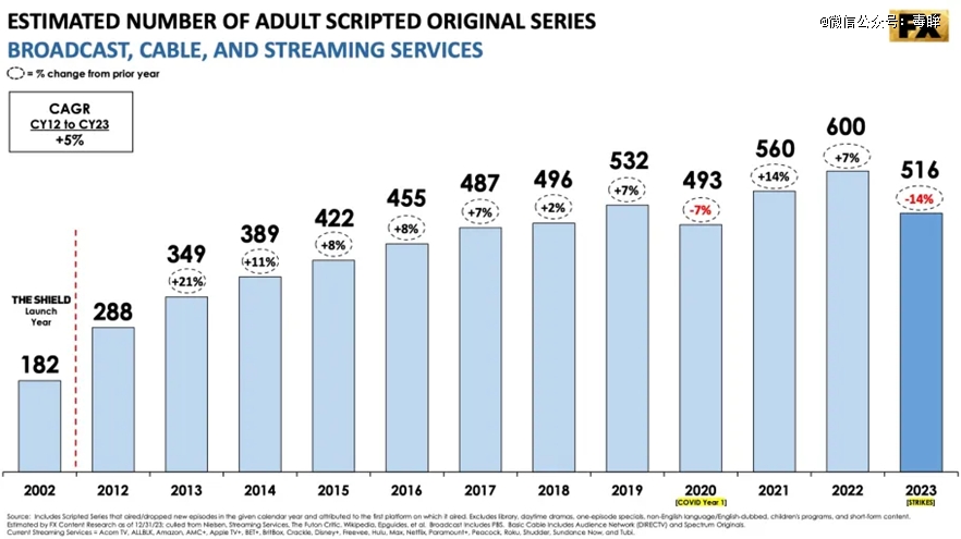 另一边的美剧市场也不好过。受到疫情和好莱坞的双重影响,好莱坞业务萎缩严重,一位制片人接受《Deadline》采访时提到,“我从未见过大家如此对环境感到沮丧。除了Netflix,现在没有公司在大量购买内容作品。”据FX统计,不算2020年,原创剧集数量在2023年首次减少,跌幅达14%。