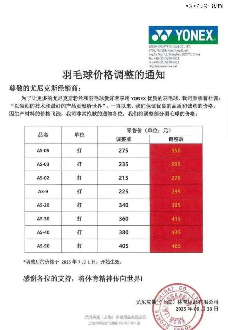尤尼克斯发布的调价公告中,明确提到了原材料价格上涨的影响。(图/尤尼克斯)