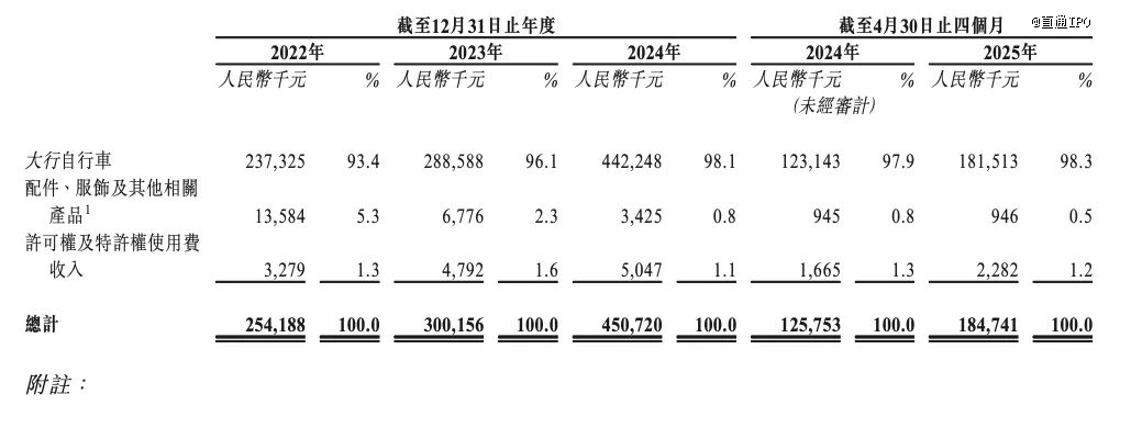 2022-2024年及今年前4个月,大行自行车的收入分别约2.37亿、2.89亿、4.42亿、1.82亿元,占总收入的比例分别约93.4%、96.1%、98.1%、98.3%。