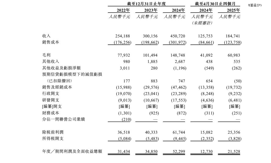招股书显示,2022-2024年及今年前4个月(下称:报告期),大行的营业收入分别约2.54亿、3.00亿、4.51亿、1.85亿元,2022-2024年复合年增长率达33.1%;毛利分别约7793.2万、1.01亿、1.49亿、6098.3万元,毛利率分别为30.7%、33.8%、33.0%、33.0%;净利润分别约3143.4万、3485.0万、5229.9万、2152.8万元,2022-224年的复合年增长率为29.1%。