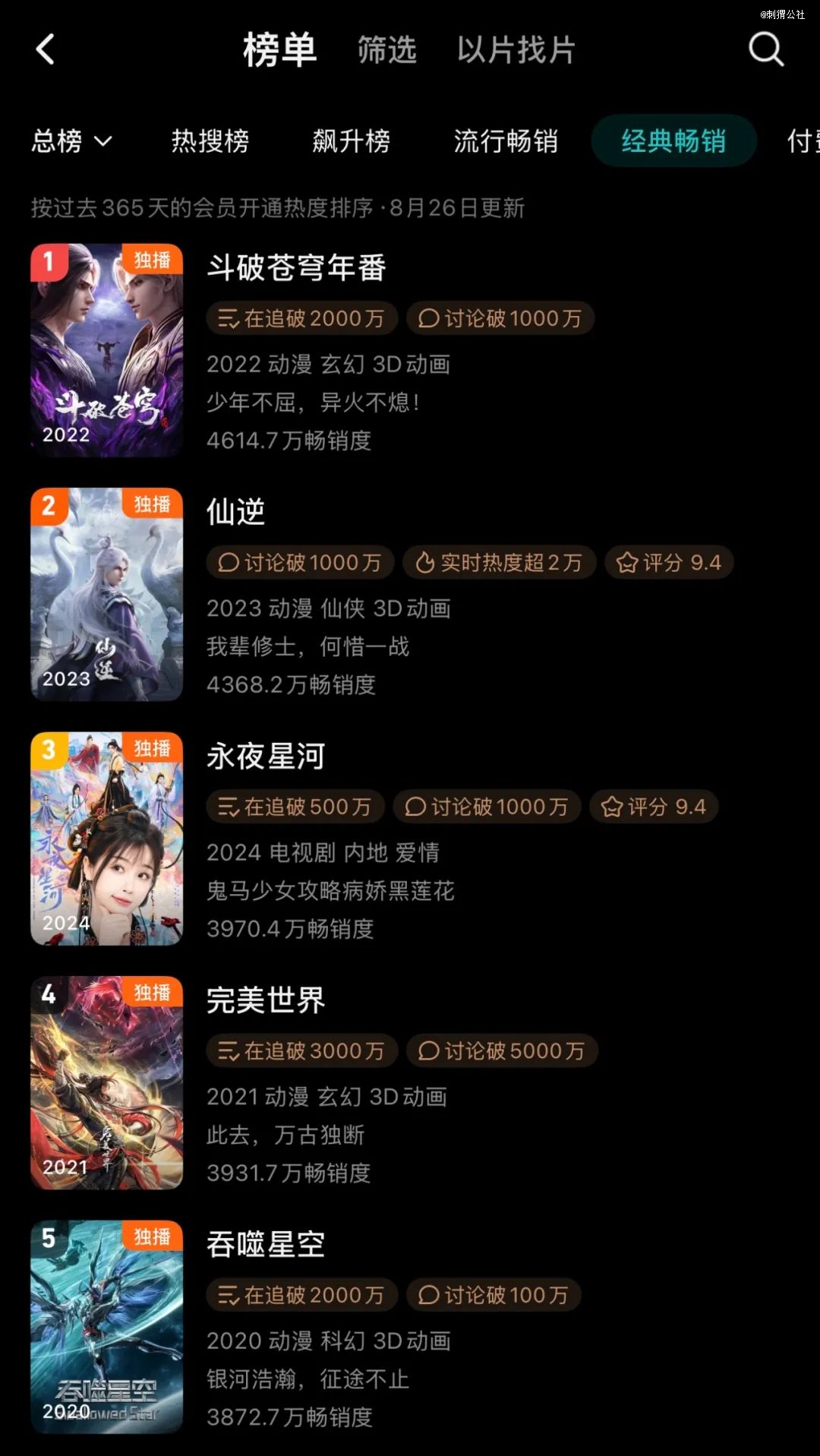至于商业化层面,网播动漫成了视频平台稳定付费会员大盘的压舱石。截至定稿时,在腾讯视频App基于过去365天会员开通热度排序的经典畅销榜上,前10名里有5部均为男频网文IP改编的动漫作品,《斗破苍穹年番》与《仙逆》更是包揽了冠亚军。