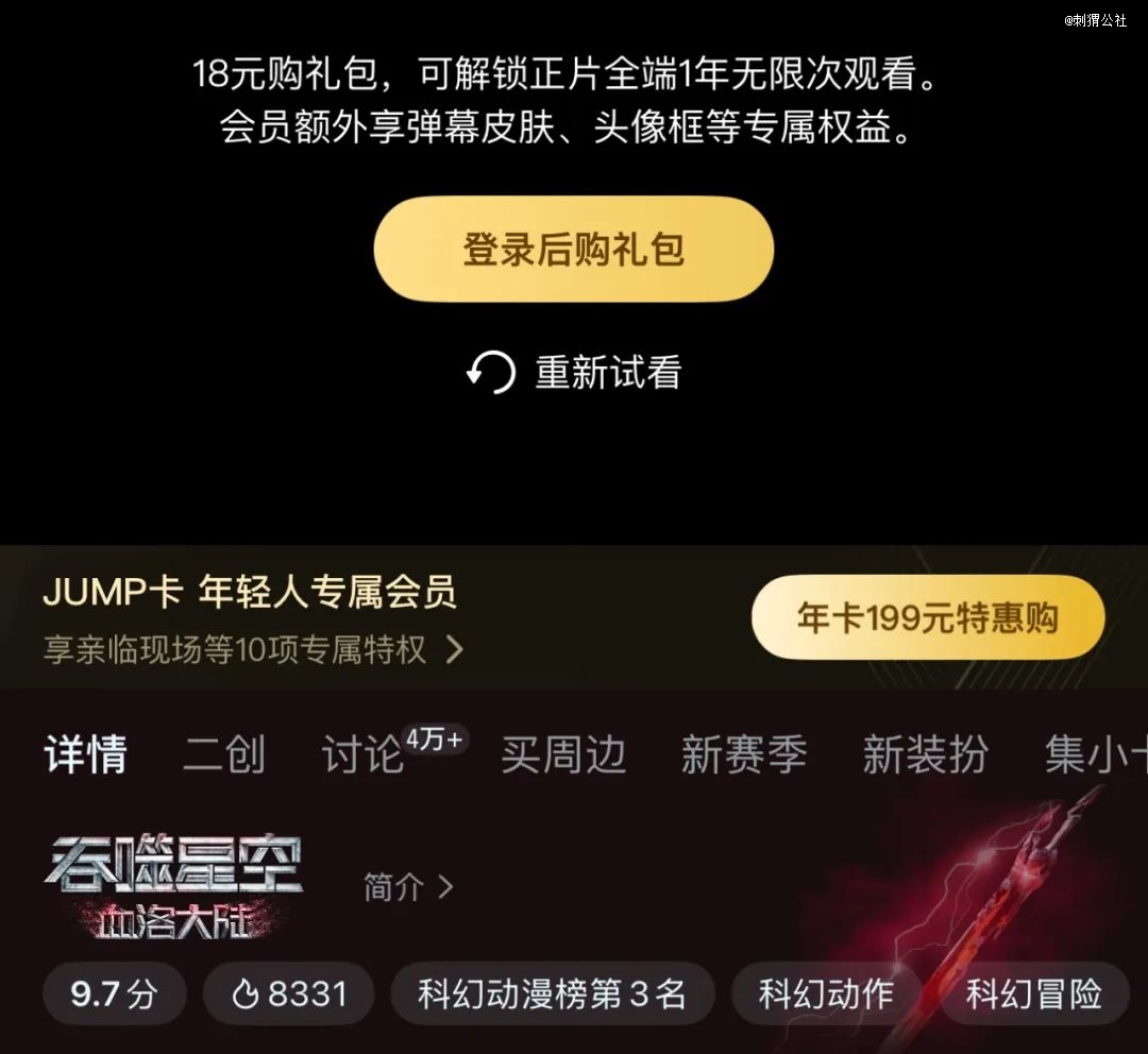 以位居腾讯视频经典畅销榜第5名的国漫《吞噬星空》为例,2024年《吞噬星空剧场版:血洛大陆》网播上线,时长约为93分钟,观影礼包价格为18元。目前,该剧场版站内评分为9.7分,累计评论量超4万。从前排的高赞评论来看,核心用户的付费热情相当高涨。与此呼应的是,同IP下的新一部剧场版《决战原始星》也已提上日程。