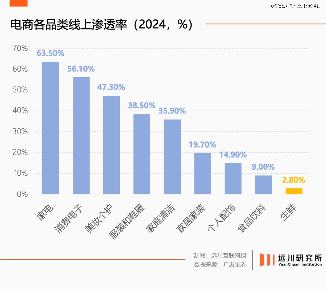 和外卖一样,电商的理论天花板是14亿人所有东西都在线上买,但这不太现实。不同品类的线上化率一定存在上限,上限高的如数码3C和化妆品,上限低的如生鲜,酣战多年线上化率依然只有2.8%。