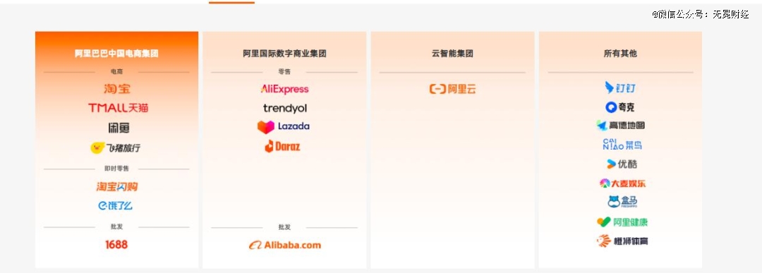 今年8月22日,阿里巴巴官网显示,阿里旗下业务从原有的六大业务集团被划分为四大业务类别,分别为阿里巴巴中国电商集团、阿里国际数字商业集团、云智能集团以及所有其他业务。
