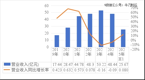 财报显示,2020至2023年,公司营收从28.47亿元增长至53.22亿元,净利润则在2021年达到高点1.54亿元后,2024年下降至0.6亿元。2024年营收回落至48.44亿元;净利润大幅上升至1.14亿元,仍未能恢复到2021年水平。
