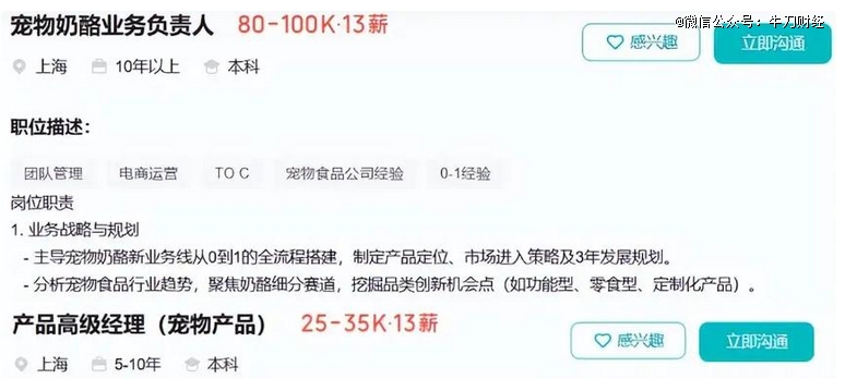 另一个岗位“高级宠物产品经理”也开出了2.5万-3.5万的月薪,需要负责制定并执行产品策略,达成销售目标、市场份额及利润指标。