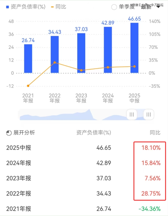 在经营稳健性方面,妙可蓝多或面临一定财务压力。存货周转天数为68.65天,较2024年上半年下降21.0%,存货管理效率提升;但经营活动产生的现金流净额同比下滑0.05%,2025年上半年资产负债率为46.65%,同比增长7.15个百分点,债务负担有所加重。