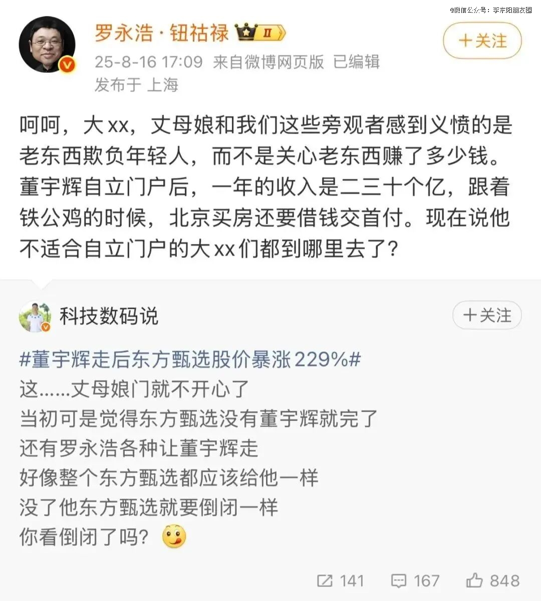 我还有一计,既然俞敏洪和董宇辉目前都想要流量来解渴,那不如参考隔壁董明珠和孟羽童的合体直播,来一波冰释前嫌,热度绝 对爆炸。