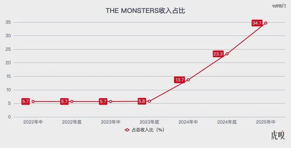 2025年上半年,包括LABUBU在内的THE MONSTERS实现营收48.1亿元,同比增长668.0%,是泡泡玛特旗下增速最快的IP。而在占比上,THE MONSTERS贡献了公司上半年收入的34.7%。