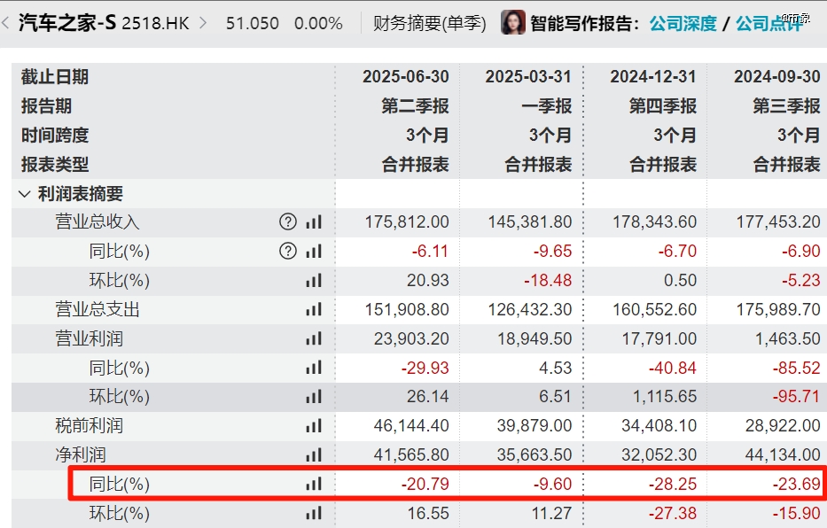 带给股东和投资者打击的,不仅仅是这一份不漂亮的财务报表,而是汽车之家连续几个季度的净利润大幅下滑。从去年三季度开始,汽车之家的净利润下滑速度加快,当季度同比降幅达到23.69%;去年四季度的净利润同比降幅进一步加大,达到了28.25%,是自2022年第二季度以来的同比最 大降幅,可以说是大“翻车”。
