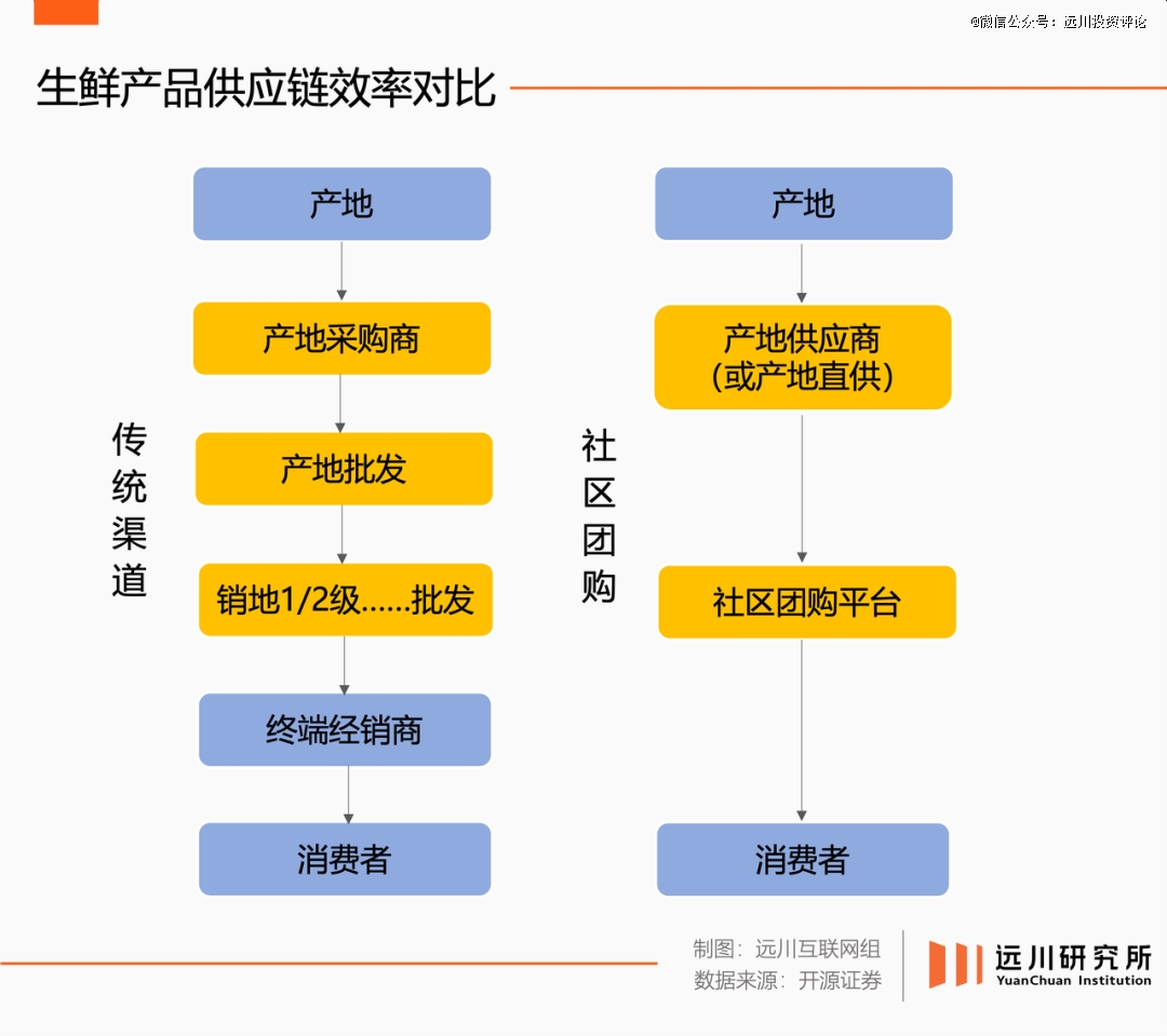 在供应链环节,社区团购同时从供需两端下手:对下游用户,社区团购的做法是“精简SKU+预售”,归集订单,以量换价;对上游供货商,社区团购对中间商应砍尽砍,要么产地直采,要么只经过一次批发商,把整体加价率从45%压缩到20%以内[5]。