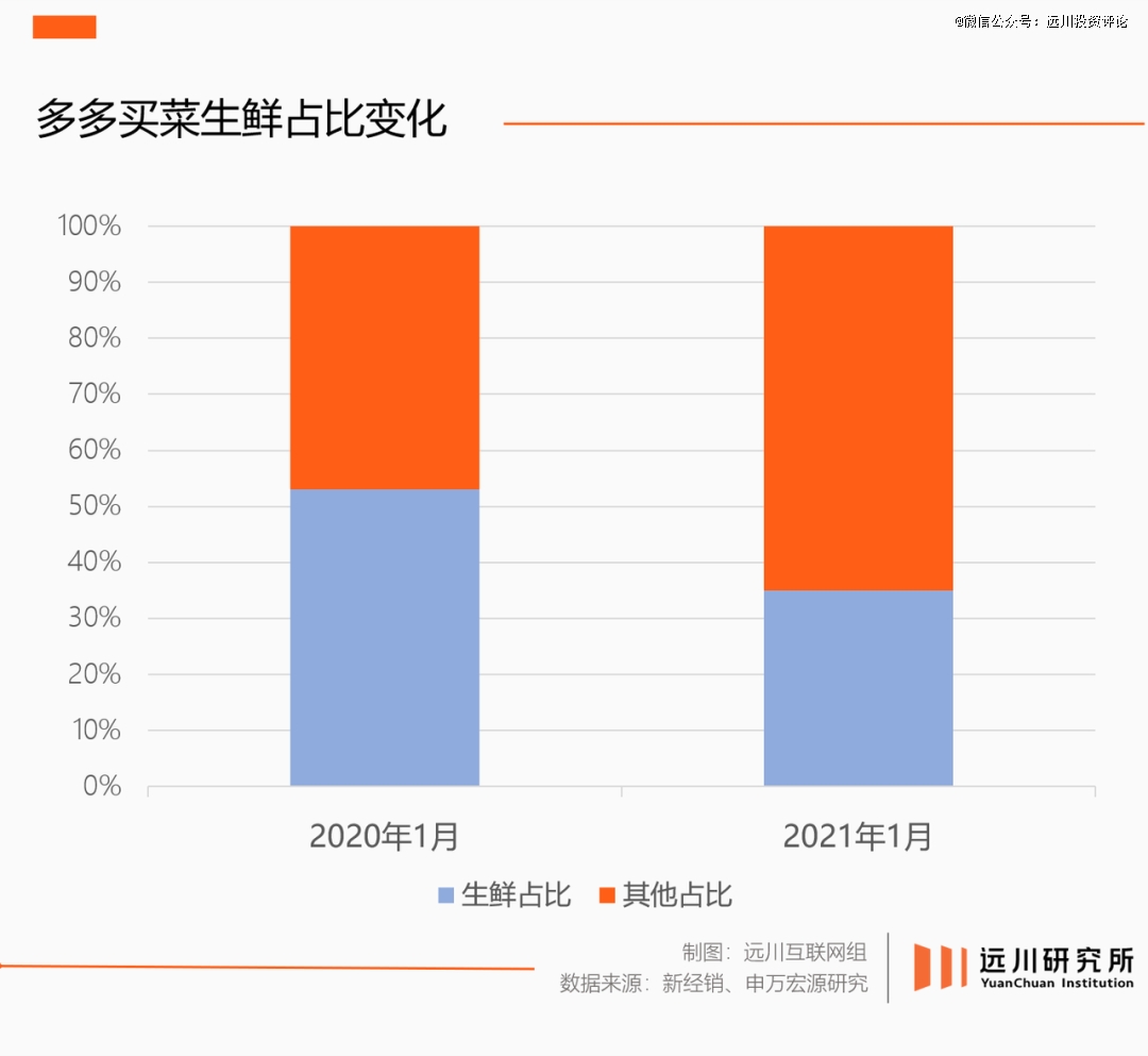 2020年底的主流社区团购平台上,生鲜占SKU比重下降到40%,占GMV比重下降到30%,接近传统商超[10]。