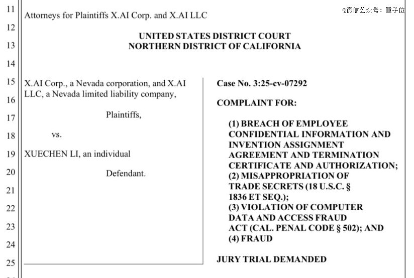 这名离职华人员工是Xuechen Li,xAI向加州北区联邦地方法院递交的起诉书显示,xAI一共对他进行了四项指控。