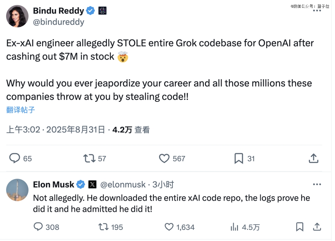 亚马逊云科技&谷歌前高管Bindu Reddy发推称,Xuechen Li偷走了Grok的整个代码库,马斯克在下方就这说,不是Grok,是整个xAI的,并且Xuechen Li已经承认,日志也能作为证据。
