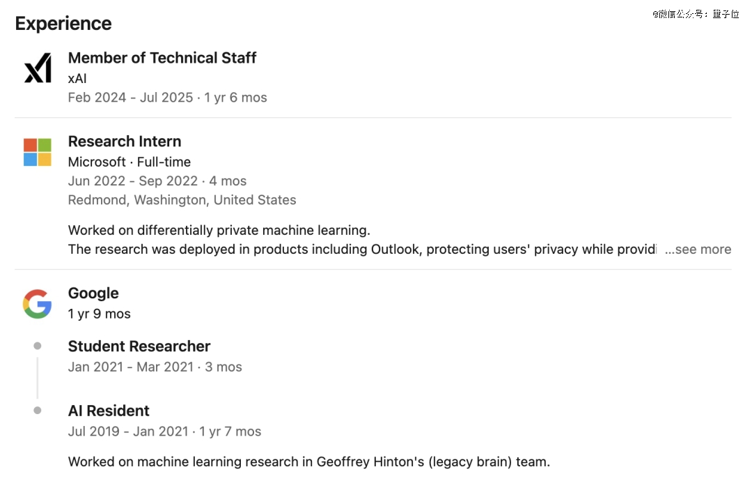 他去年从斯坦福毕业并取得取得计算机博士学位,当年2月就加入了xAI,此前曾在谷歌、微软实习。