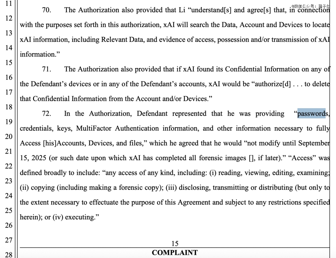 8月18日,Xuechen Li签署了一份“授权访问协议”,提供了账号密码且9月15日前不会修改,并同意让xAI的取证专家访问他的个人设备和账户,以调查和删除公司的机密信息。