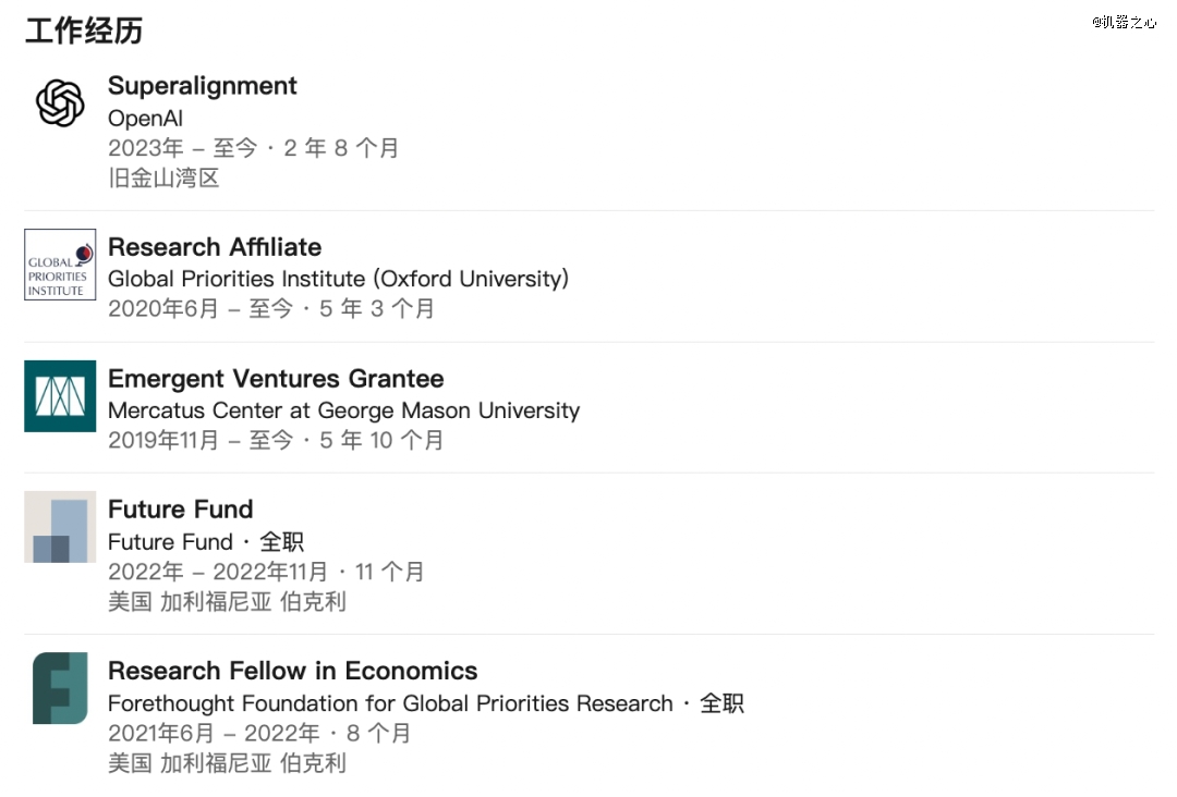 毕业后,他在牛津大学的全球优先事项研究所从事长期经济增长研究,并参与了有效利他主义运动。 他曾在 FTX Future Fund 工作,专注于 AI 安全和全球风险管理。