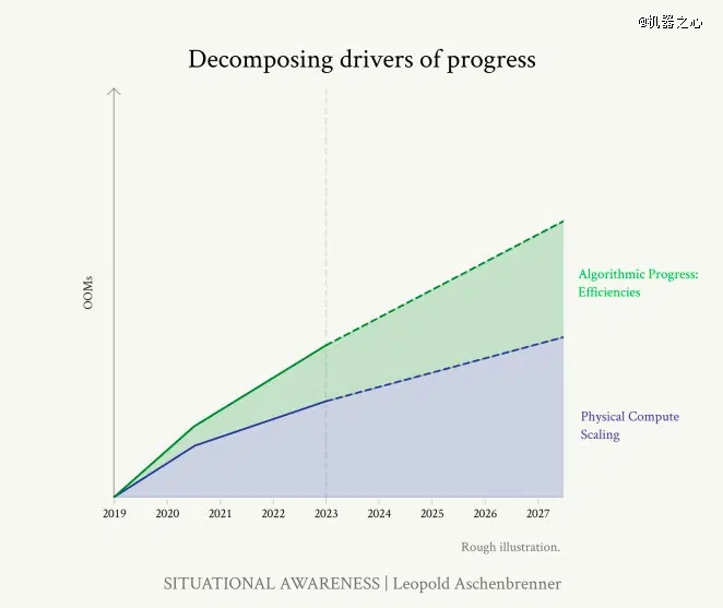 Leopold Aschenbrenner 强调了到 2027 年实现通用人工智能(AGI)的可能路径。他认为,在业界持续投入算力,提升算法效率的前提下,我们或许能够让 AI 系统在众多领域上与人类智力匹敌,甚至超越人类。