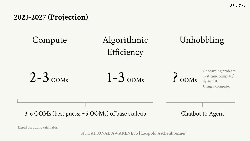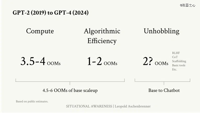 「数量级」(Orders of Magnitude,即「OOM」)的概念对于讨论至关重要。Aschenbrenner 使用数量级(OOM)来评估 AI 能力、算力和数据消耗的进步,OOM 指给定指标的十倍增长。就计算能力和数据可扩展性而言,从 GPT-2 到 GPT-4 的转换代表了许多 OOM。
